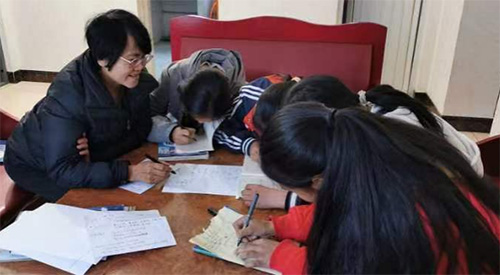 梁莹老师(左一)在察隅县中学宿舍辅导学生